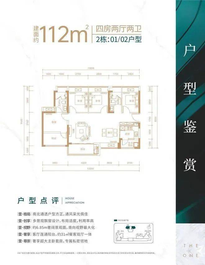 112㎡4房2厅2卫(单价7.1-7.6万总价790-850万)客厅横厅朝南带阳台,1房朝南3房朝北该户型分布在2栋01,02房