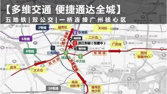 :交通网络极为发达,堪称一大亮点。1 公里内双地铁环绕,8 号线晓港站近在咫尺,10 号线滨江东路站(在建中,预计 2023 年开通)与项目距离不足 800m 。未来将形成 5 地铁环绕的便捷交通格局,畅达全城。家楼下即为海印桥南公交站,多达 24 条公交线路穿梭广州主城各区,实现与各区及各地铁口的无缝接驳。此外,“三纵五横路网” 让自驾出行也十分便捷,向北接海印大桥通达越秀天河,向东接新港西路可达琶洲金融中心,向南快速接驳南洲、番禺、南沙,全方位满足居民出行需求。