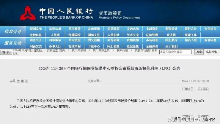 据中国人民银行授权全国银行间同业拆借中心公布,2024年11月20日贷款市场报价利率(LPR)为:1年期LPR为3.1%,5年期以上LPR为3.6%。