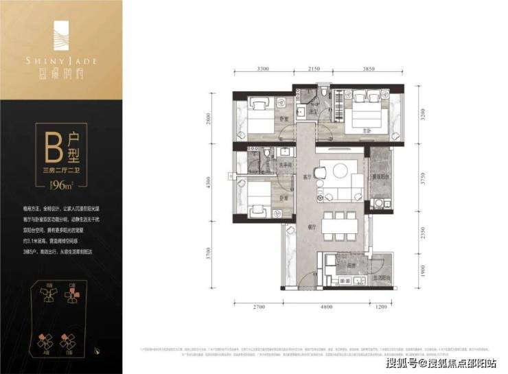建面约95㎡三房两厅两卫:方正格局,全明户型,采光通风俱佳;餐、厨、客、卧动线合理,空间使用更加顺畅;客厅、卧室动静分区,生活休息互不打扰;卧室全飘窗设计,尽享优雅精致;朗阔客厅外连观景阳台,满足对生活的美好设想。