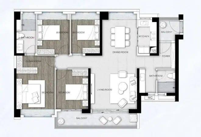项目主打88㎡至165㎡全维户型,涵盖刚需、改善及豪宅型产品,全部配备高端精装,国际品牌家装覆盖全屋。