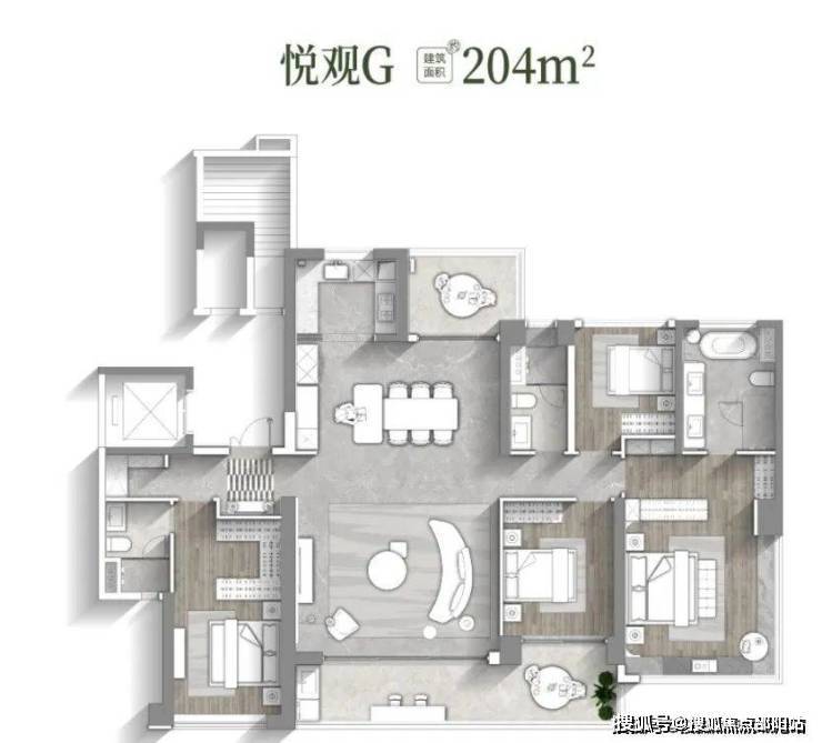 206㎡悦观 G 户型:独立电梯厅,9.3米南向阳台,双主套设计,高端改善人群的首选。