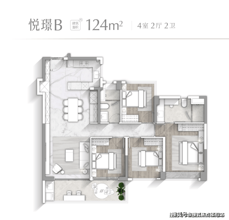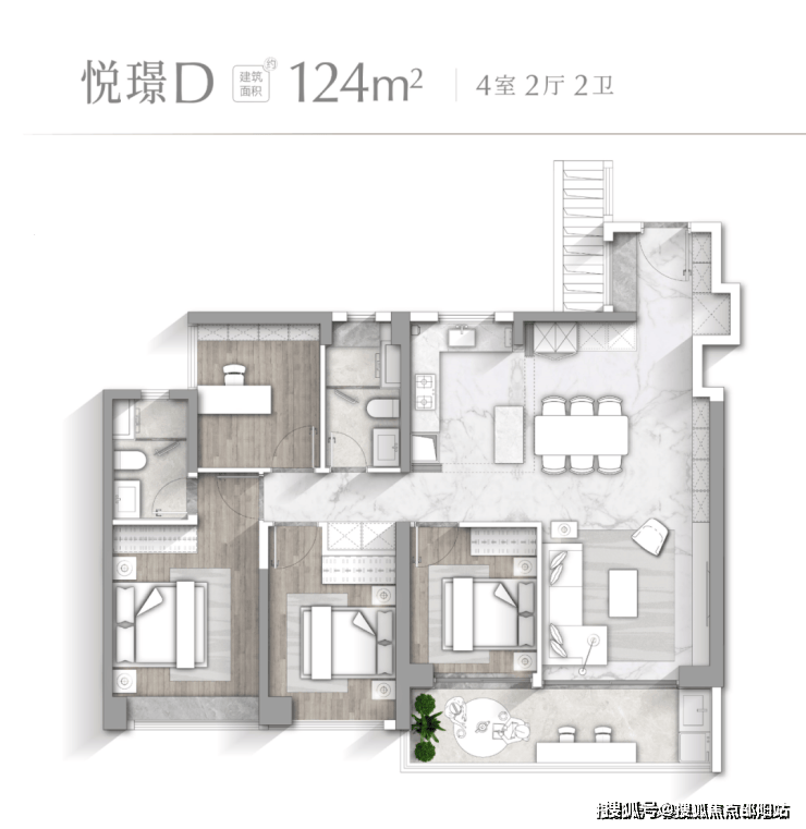 124㎡悦璟系列(B、D、E户型):三南向卧室,厅卧空间灵活改造,6.5 - 6.7米双面宽阳台,改善型家庭的理想选择。