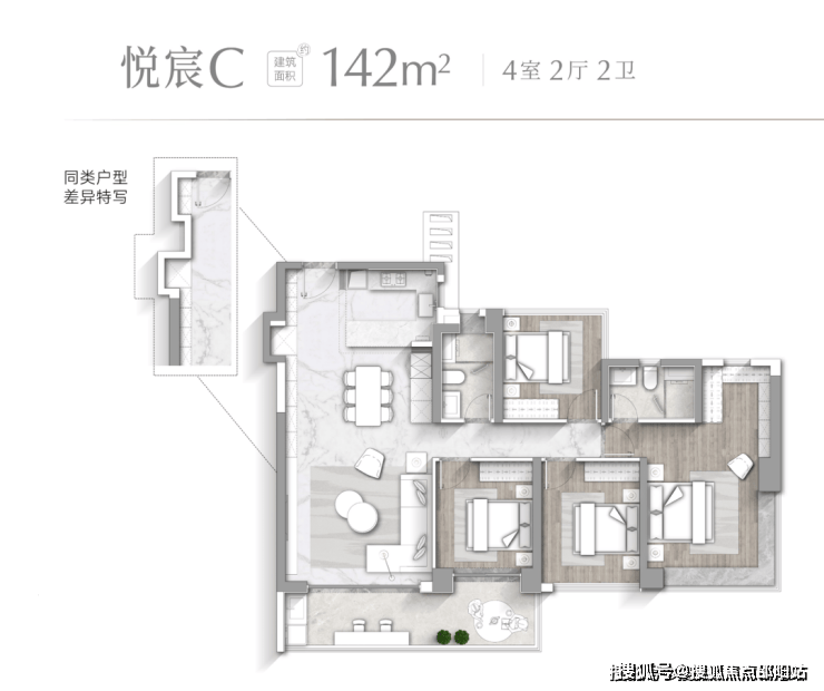142㎡悦宸系列(C、F户型):客厅开间4.6 - 4.85米,7.7 - 8.4米双面宽阔景阳台,舒适度极高。