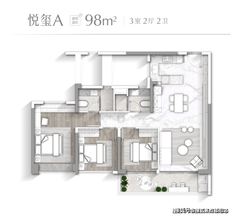 98㎡悦玺 A 户型:四开间朝南,半开放式中西厨房,LDKG布局,带6.4米阳台,适合刚需购房者。