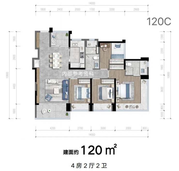 建面约120㎡4房,在产品新规下,不仅房子使用率和空间感得到大跨度提升,且空间灵活性极强。