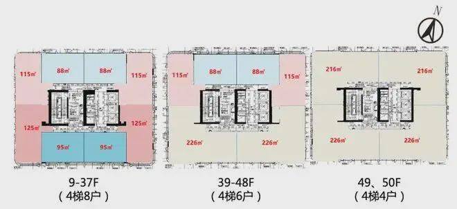 项目总高194米,共1栋,分为顶高低三个区域,低区9-38层4梯8户,面积为88-95-115-125㎡;高区39-48层4梯6户,面积为88-115-226㎡;顶层49-50层4梯4户,面积为216-226㎡ 其中88平目前已售罄。