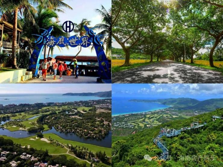 亚龙湾国际高尔夫球场、红峡谷高尔夫球场、 玫瑰谷、天堂热带雨林度假公园、最美公路太阳湾,红树林湿地保护区,亚龙湾海岸线等