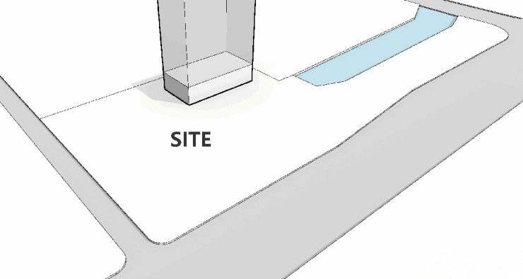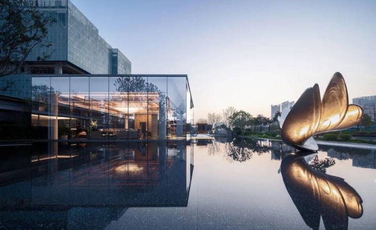 整体场地的塑造以环境,园林为主导,建筑露出地面的建筑体量尽量弱化,整体意境像极中国山水画中“山水“与“亭子”的关系。因此建筑体量以纯净通透的玻璃盒子出现在场地中,与场地周围的镜面水池形成“水镜宝盒”的空间体验,以纯净典雅的姿态漂浮于街角水景之上,与沿街一路展开的景观界面共同营造隐奢的场景氛围。