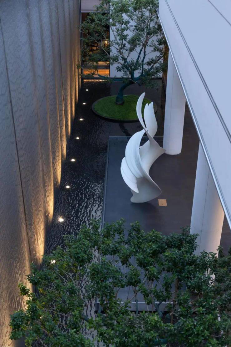 品质与自然兼具的下沉庭院空间。虚实变化的立面和跃动的光影相映,让整个空间充满了静谧氛围。不同视角是不同的风景,纯净的水面与柔性流动的植物绿岛均赋予空间独特的美感。