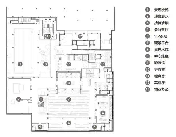 雅园之下,围绕下沉庭院布置的“水晶会所”则为项目定义了丰富的场景体验。顺应岭南地区湿热气候特点,大量灰空间渗透内外,丰富建筑层次关系,给予空间活跃的流动性。