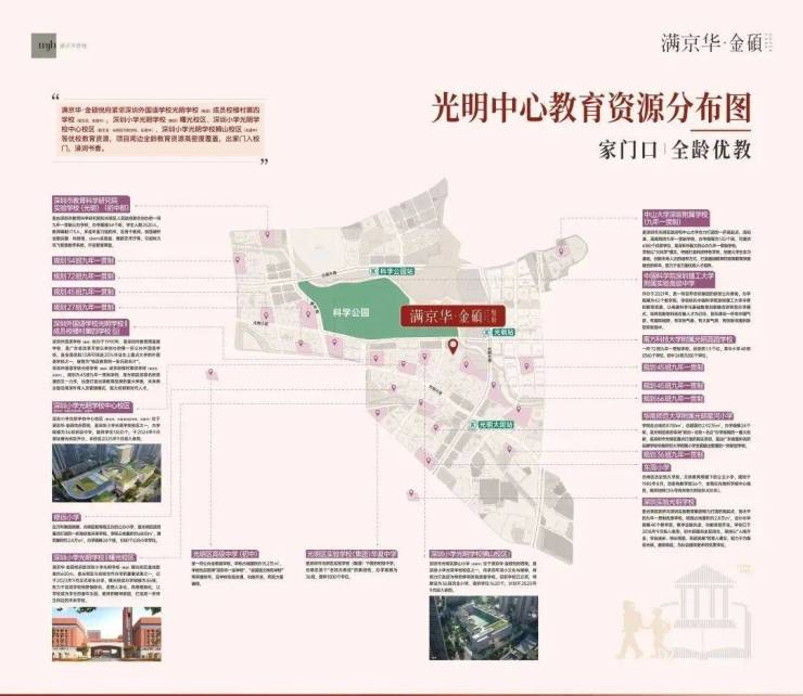 满京华·金硕项目直面占地约208万㎡的科学公园(在建中),近享深圳国际美术馆(暂定名、在建中)、深圳科学技术馆、科学城体育中心(在建中)、会议中心(规划中)等市政级文体配套;还坐拥狮山公园(规划中)、约9.4万㎡的东周文化公园,约10万㎡的开明公园,约56万㎡的新城公园等丰富绿色生态资源。