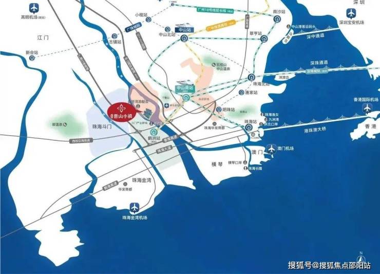 ▣未来2大轨道枢纽、 3轨道畅行广深珠 项目所处的南部新城核心区规划有中山南站,毗邻的斗门白蕉片区规划鹤洲站,规划广中珠澳高铁、深珠城际、广州18号线延长线三轨交汇,便捷通达广深以及珠澳,1站到广州,2站到深圳。