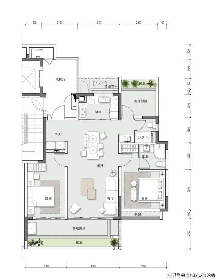 亮点:南向客厅面宽7米进深4米,空间利用率高,L型厨房联动客厅,南向面朝景观公园带。