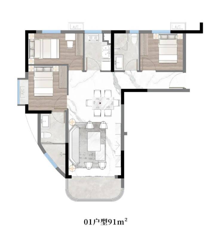 现代美学匠筑 豪华精装交付建筑面积约 78㎡-86㎡-91㎡-101㎡-110㎡二至三房,全新住宅现楼,豪华装修交付,灵动空间设计,合理布局用心打磨每处细节,让生活变成一种享受。01户型:约91㎡,三房两厅两卫带主套