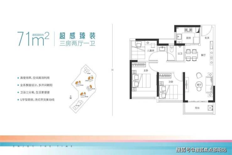 是经典竖厅,东南、东北朝向户型,明亮通透方正。户型设计和71平的类似,但是这个三房空间更为阔绰,主卧套房式设计,带有卫生间,私密感强。客餐厅一体化设计,功能灵活多变。整个户型也非常方正,3开间朝南,明亮通透。南山悦时光售楼处电话: 400-832-5521