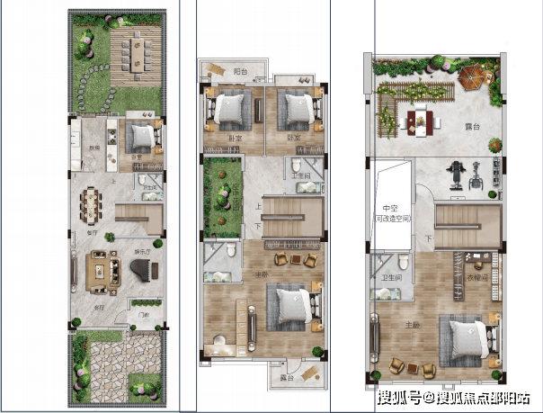 四联二层半,建筑基底卙地约100㎡,6.8米开间客厅面积:62㎡,三主套设计带约67-125㎡超大花园露台+中空赠送面积约50㎡