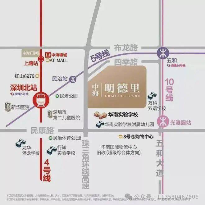 约1.1公里民治地铁站(5号线,规划中22号线),1.3公里五和地铁站(5号线、10号线)