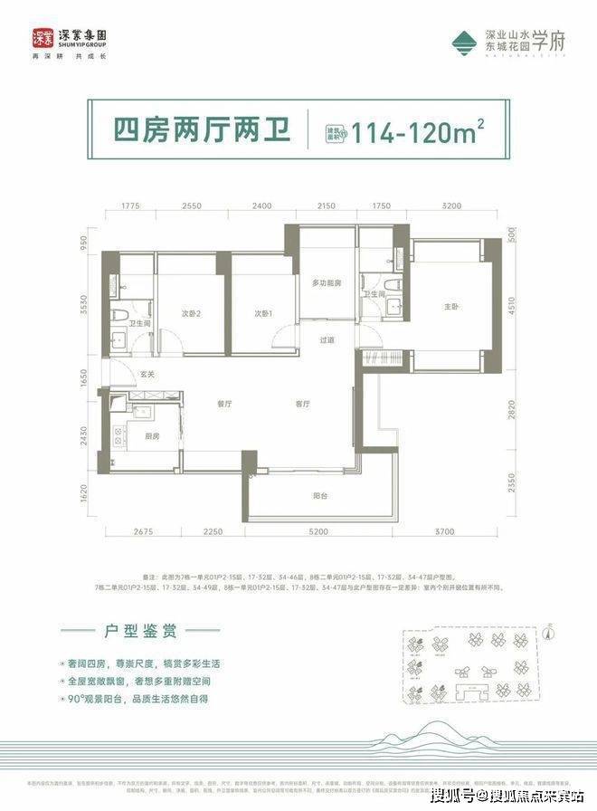 114-120㎡的4房2厅2卫,设计的是横厅南北通透格局,客餐厅一体化,4个卧室分别做到了3.2米/2.55米/2.4米/2.15米的宽度,主卧南北通透,5.2米长的L型大阳台,U型厨房,卫生间干湿分离,得房率:75%(不含赠送),阳台主朝东南向。