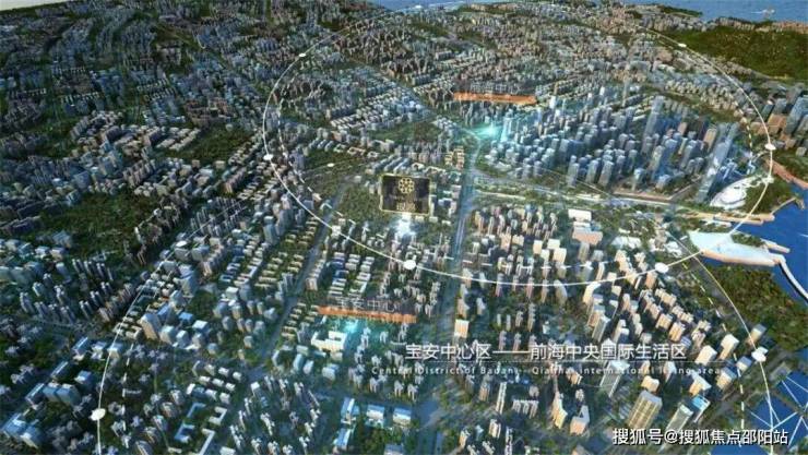 中国湾区,世界前沿前海自贸区,粤港澳世界大湾区核心,多重国家战略支撑,中国未来经济新引擎。前海与宝中双核辐射区,多轴交汇。