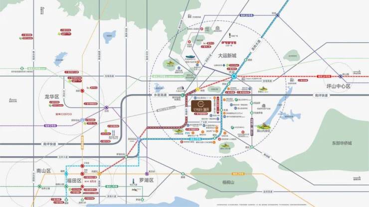 🏛约5公里范围:尽揽百万㎡商圈,星河COCOPark(龙岗山姆会员店)、大运天地、恒大城市之光、天光城等知名商业体环伺,畅享都市繁华便利。