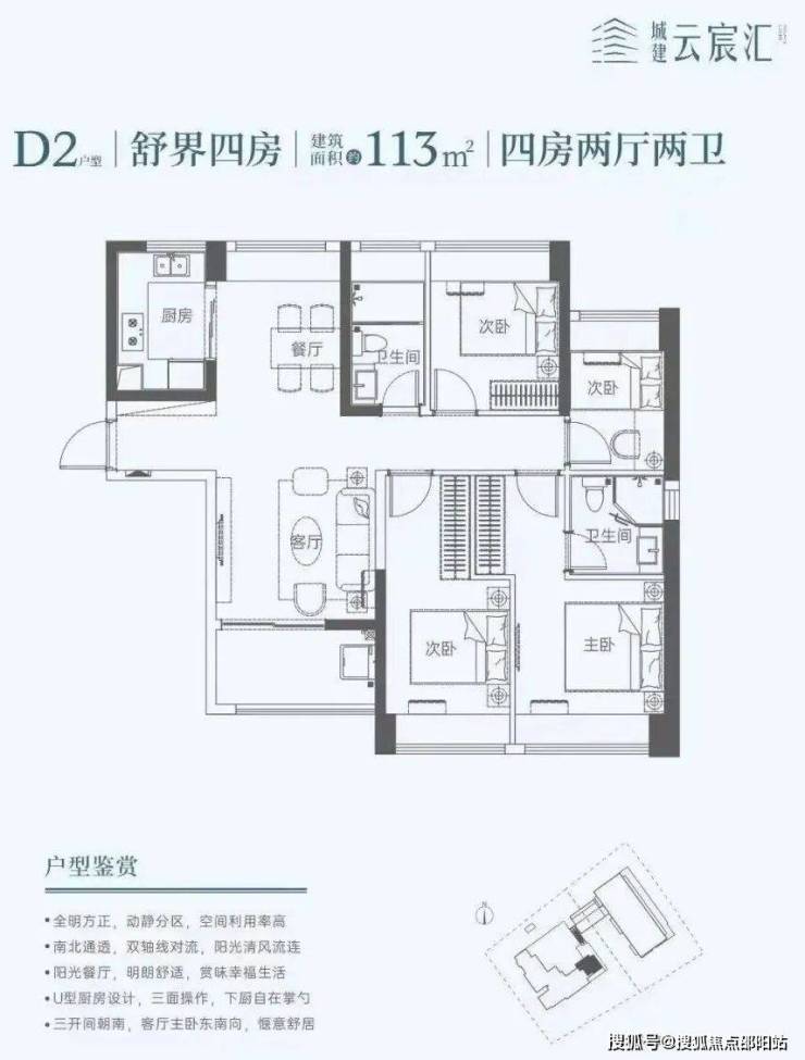 113㎡的4房2厅2卫,设计的竖厅南北通透格局,餐客厅一体化,U型厨房,阳台东南朝向