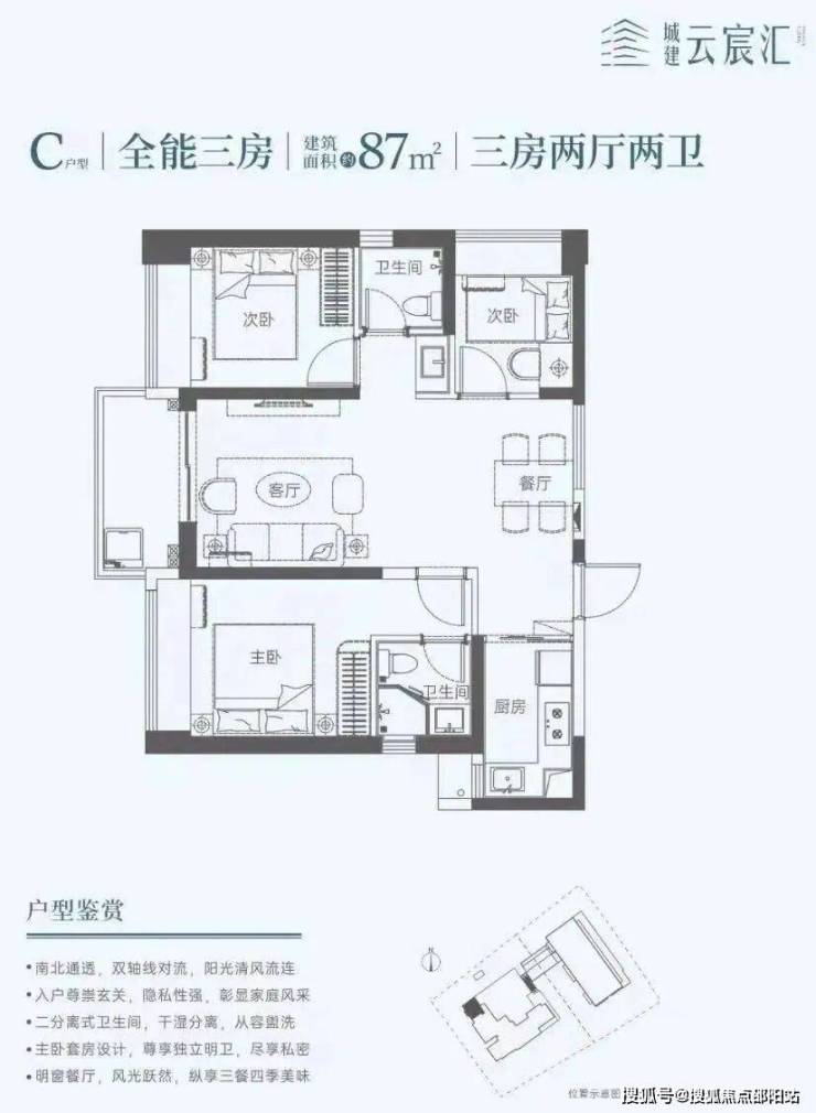 87㎡的3房2厅2卫,设计的双龙抱珠格局,餐客厅一体化,L型厨房,东南朝向。