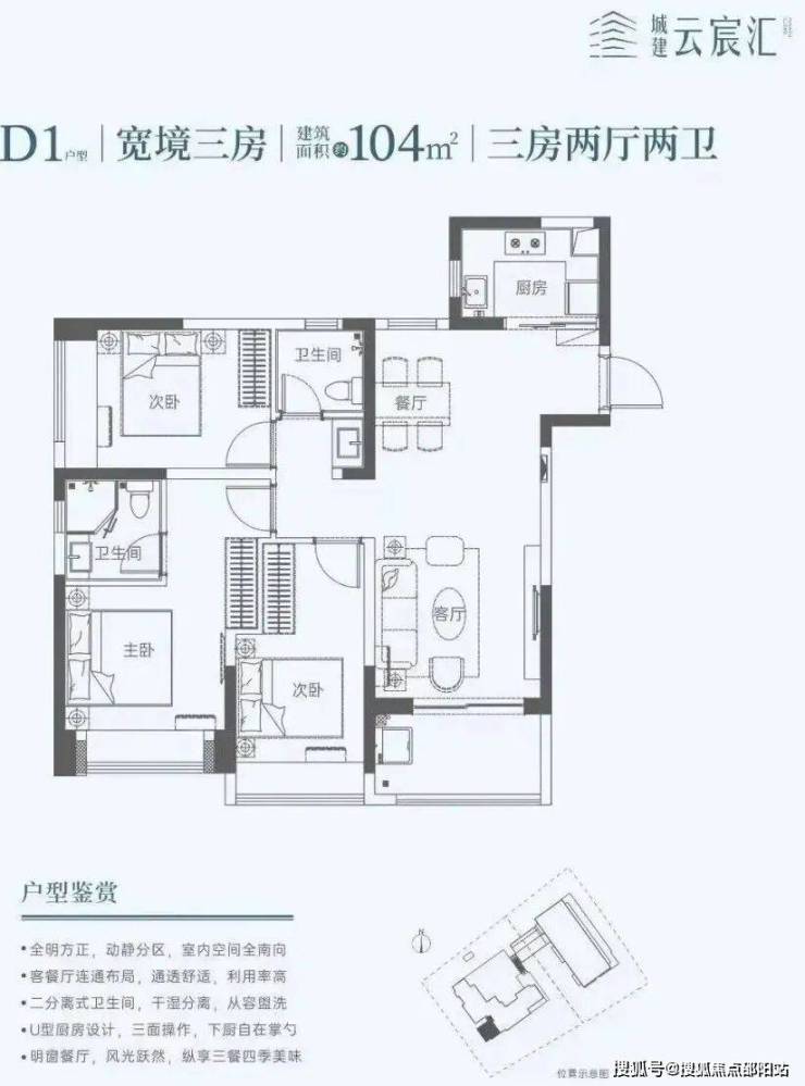 104㎡的3房2厅2卫,设计的竖厅南北通透格局,餐客厅一体化,U型厨房,阳台西南朝向。