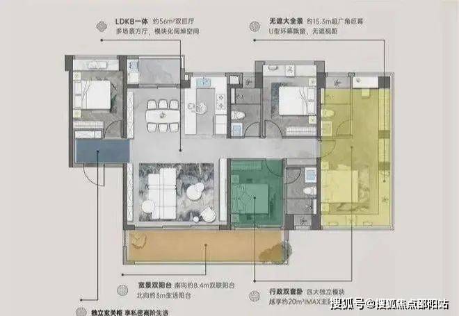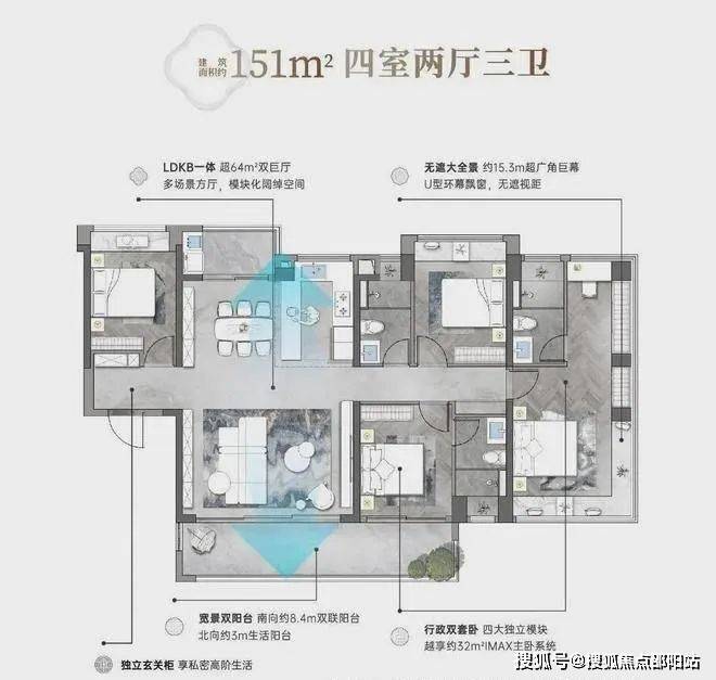 建面约151㎡四房:超64㎡的双巨厅,搭配约8.4米的景观阳台和约3米的生活阳台同时做到三面采光,全屋飘窗总长达约24.1米,属于同类面积段产品罕有的配置。