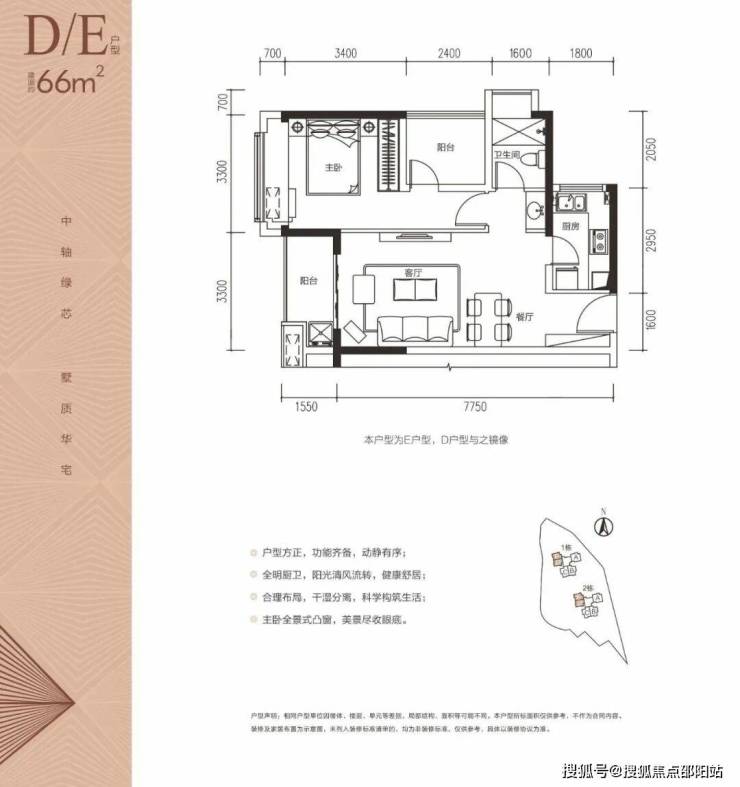 户型点评:均为朝南方位,户型整体方正实用,功能布局合理;两个卧室均带有飘窗,便于采光通风,阳台空间可灵动改做次卧或书房,整体利用率较高。