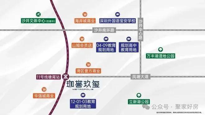 公共交通方面,「珈誉玖玺」位于综合体南侧,临近11号快线塘尾地铁站。