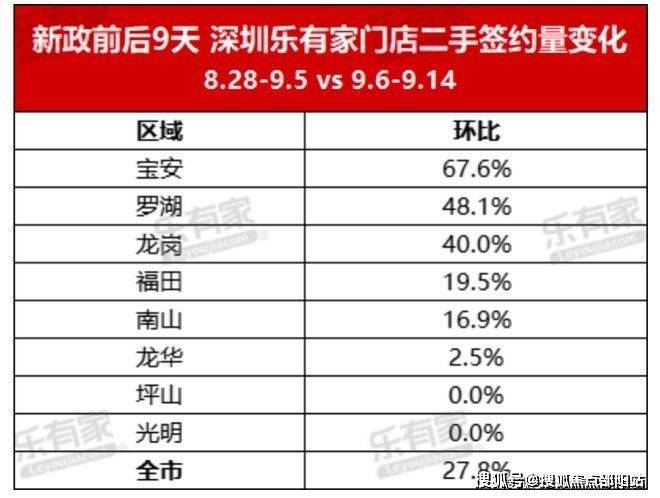 而中介机构则统计了深圳新政后9日的数据,即9月6日~9月14日,全市二手房签约量环比增长27.8%。其中,宝安、罗湖、龙岗的二手房签约量位居前列。