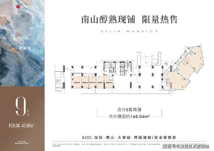 9栋1楼商铺共计5套,约165.04㎡,层高约4.5米,可作为整体销售,定位为工作室或办公使用;