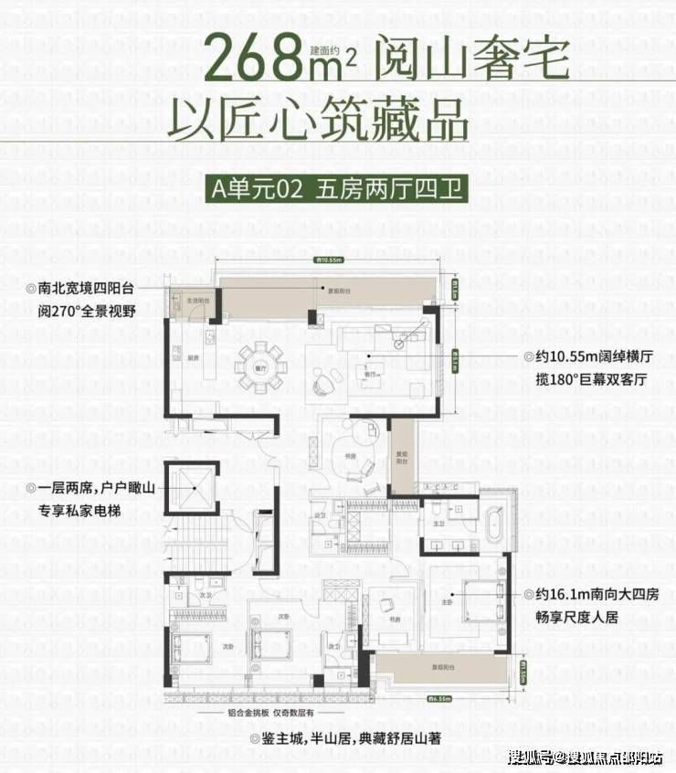 同样的专梯入户,豪宅感扑面而来,该户型为顶级大户型,四阳台设计,最大有10.55米的景观阳台和180度视野的餐客厅空间奢阔气场尽显,罕见的南北瞰景四阳台设计,让家的每个角落都能欣赏美丽的山景和城市景观。所有的开窗面都尽可能放大,客餐厅、书房、卧室、几乎都能享受超宽超大屏
