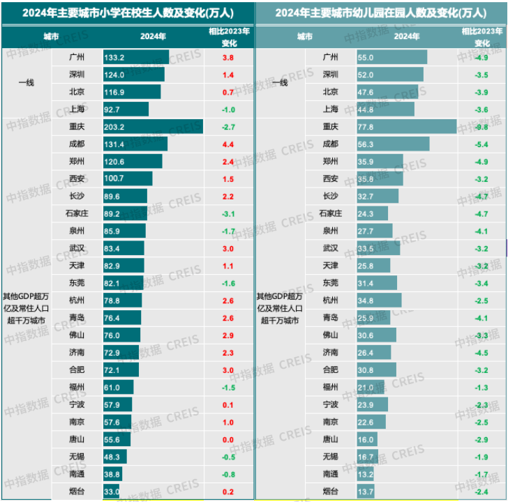 从对房地产的影响角度来看,在园幼儿和小学生规模大意味着城市拥有更多的年轻家庭,随着孩子成长过程中对居住空间需求的变化,更多改善性购房需求将得到释放,进而对城市房地产市场形成更强的支撑。其中,一线城市在较大人口基础上,在园幼儿及小学生规模均较大,广州、深圳在园幼儿均超50万,小学生数量分别达133万和124万人,规模全国领先,相对京沪更宽松的人口政策,为广深带来较为充足的人口潜力,除上海外,北京、广州、深圳小学生规模保持增长。二线核心城市中,重庆城市体量相当于中等省份,幼儿园在园人数和小学在校生人数分别达77.8和203.2万人,均居全国首位,但2024年出现明显下滑,尤其是在园幼儿减少近10万;成都规模同样较大,幼儿园人数位居全国第二位,达56.3万人,小学在校生位居全国第三,超过130万,且2024年同比增长4.4万,在核心城市中增量最大。此外,2024年郑州、西安小学在校生规模也超过百万,在园幼儿规模超35万,人口规模突出;武汉、合肥、佛山、杭州、青岛等城市小学生增量超2.5万,人口活力较强。