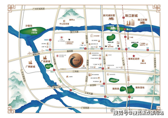 中冶·逸璟公馆坐落于广州市海珠区核心地段,地处宝岗大道与江燕路交汇处,紧邻广州塔、琶洲国际会展中心等地标。项目所在的“三横五纵”交通网络(昌岗路、江南大道等主干道)及地铁2号线、8号线、在建11号线(2024年通车),使其20分钟内可达珠江新城、金融城等核心商圈,30分钟通达白云机场,区位优势显著。