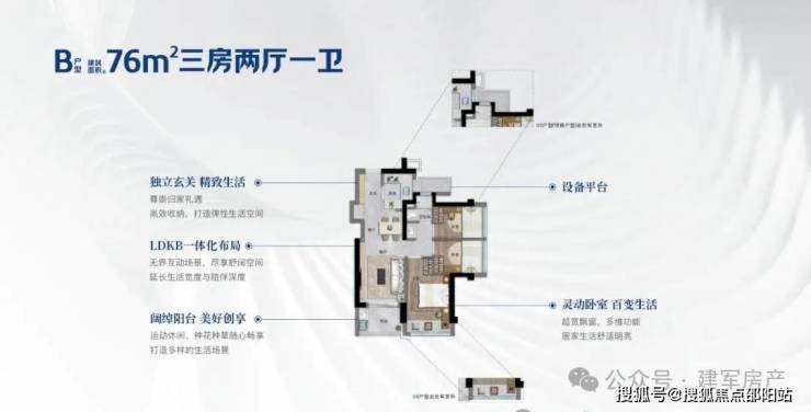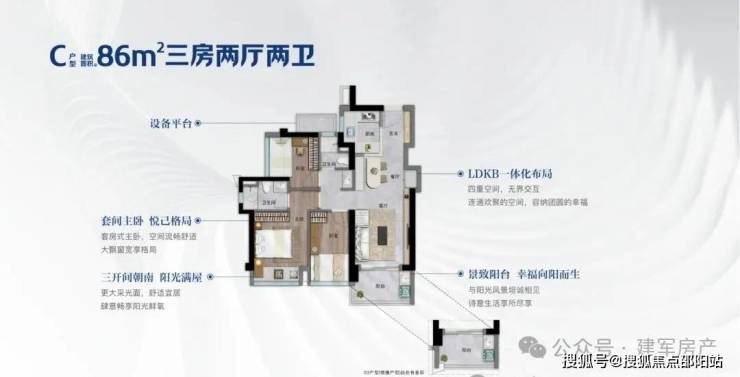 86㎡的3房2厅2卫,设计的是经典竖厅格局,客厅3.2米开间,入户玄关八宝库,LDKB一体化,S墙设计预留冰箱卡槽位,动静分区,三开间朝南,U型厨房,公卫三段式分离,还送1个设备平台,得房率约75.9-76.6%(不含赠送),西南或东南朝向。