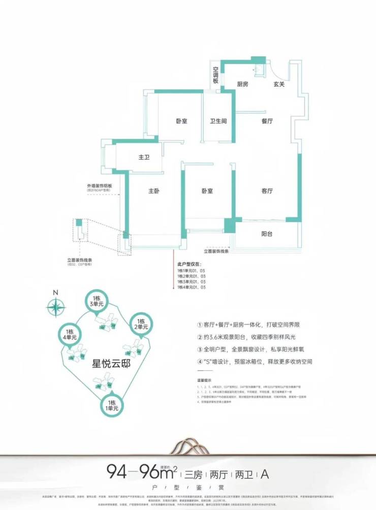 94㎡的3房2厅2卫,设计的经典竖厅格局,客厅3.6米开间,客餐厨一体化,S墙设计预留冰箱卡槽位,三开间朝南,3个卧室分别做到了主卧14.41㎡/次卧9.72㎡/次卧8.23㎡(包含墙体飘窗),U型厨房,得房率:78.15%(不含赠送),西南或东南朝向。