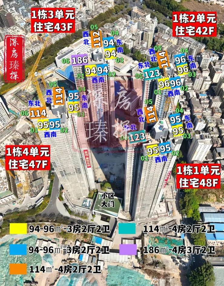 星河星悦云邸,总占地面积约1.97万㎡,总建筑面积约15.4万㎡,计容建筑面积约11.7万㎡,容积率5.9,绿化率40.07%,共由1栋4个单元总高42-48F的住宅组成,其中1栋1单元住宅48F,1栋2单元住宅42F,1栋3单元住宅43F,1栋4单元住宅47F。