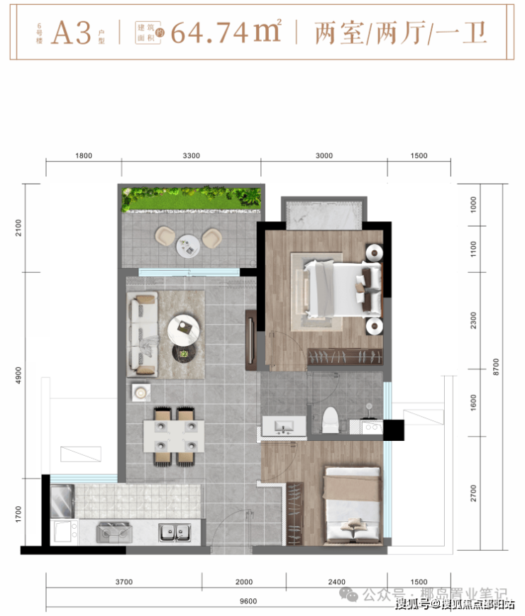 ✨ 6# 楼A3户型约64㎡精致两房两厅一卫