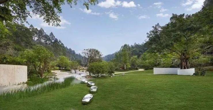 其承大国之院落,取云山之厚重,打造现代版履道坊——花溪谷,绿植山体环绕,重点打造瀑、潭、溪、涧、湖等不同形态的水景,配以桥、亭、阶、坡景成就一座院藏云山的大美园林。