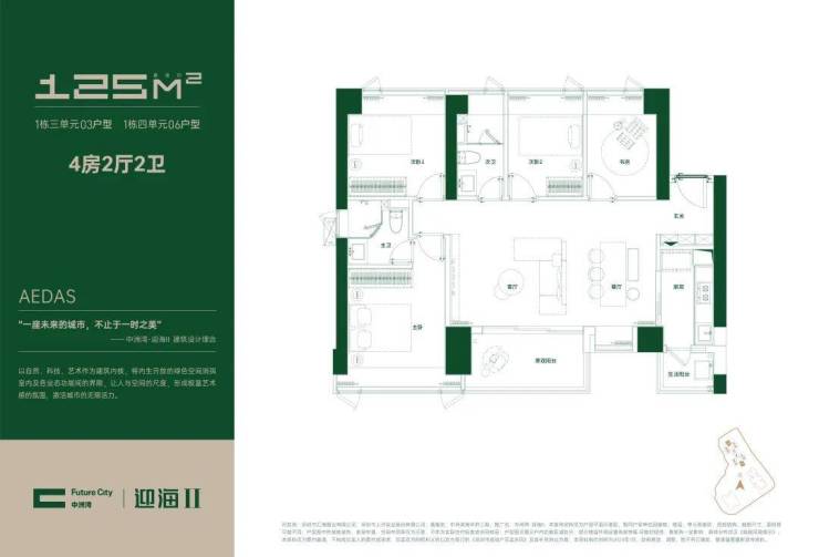约125㎡4房2厅2卫户型:也是大横厅布局,放大了约109㎡户型的全部优点。端头位置,三面采光,四面宽朝南看海景,约12米观海面宽,海景生活更极致。