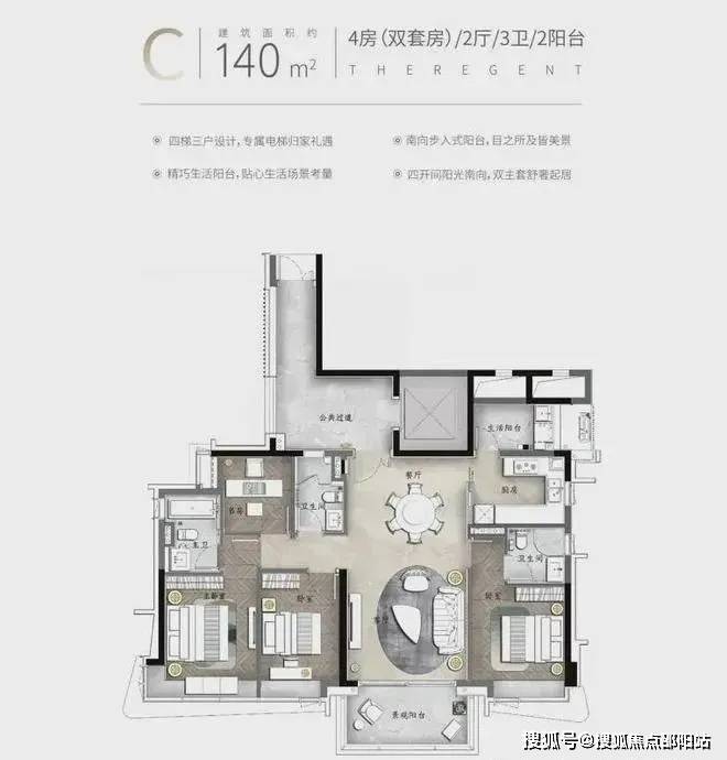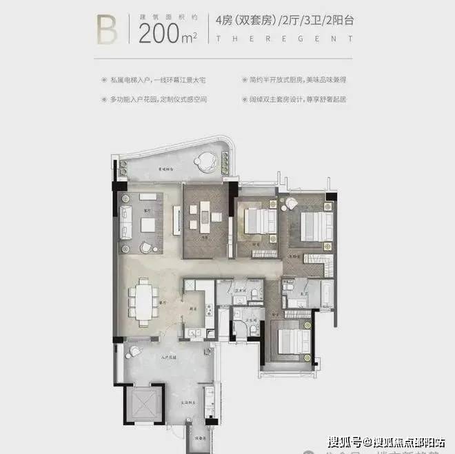 产品亮点:私家电梯入户、约3.4米层高、动静分区南北对流、约6.8米挑空餐客厅、中西双厨、三套房设计、部分房间带阳台设计