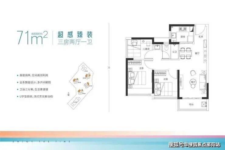 以西北、西南、东北朝向户型为主,每栋均有分布,采光通风好,使用率高户型方正通透,3开间朝南,采光通风好;户型紧凑,布局合理,使用率超高;卫生间3分离设计,干湿分离,互不干扰。每个卧室都带有飘窗,空间感强。