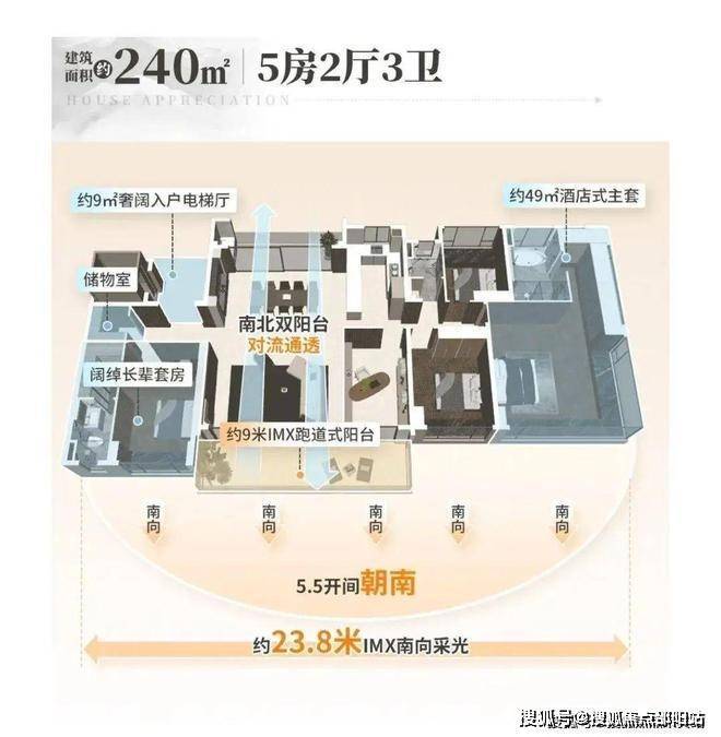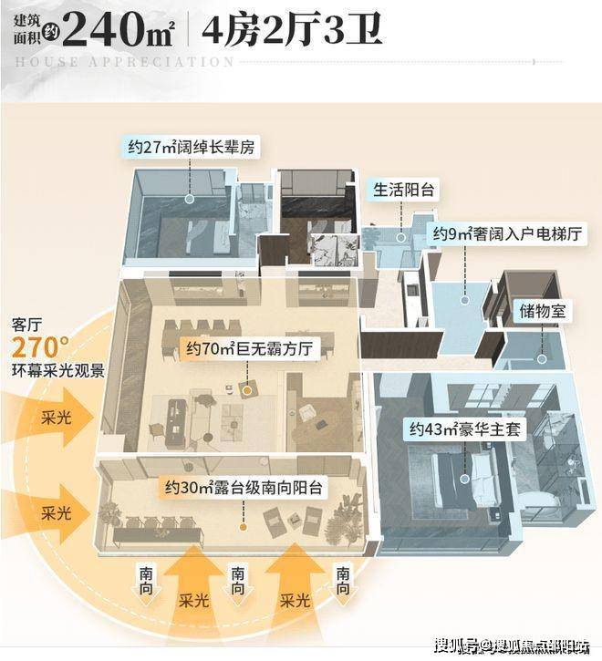 建面约240平四房3卫,标配约9㎡奢阔入户电梯厅。