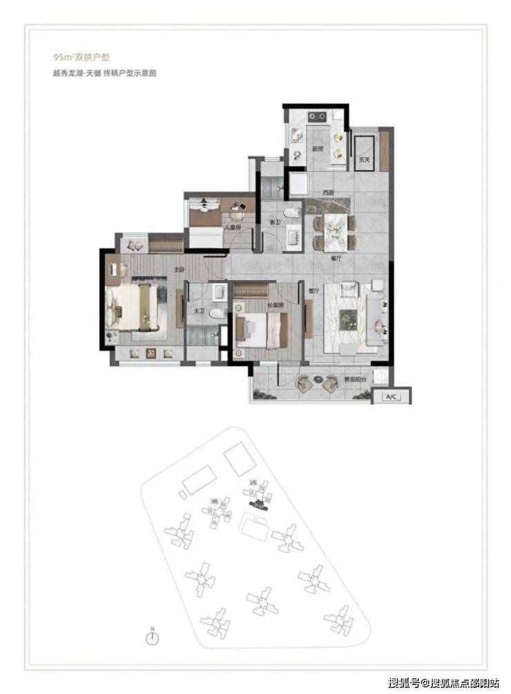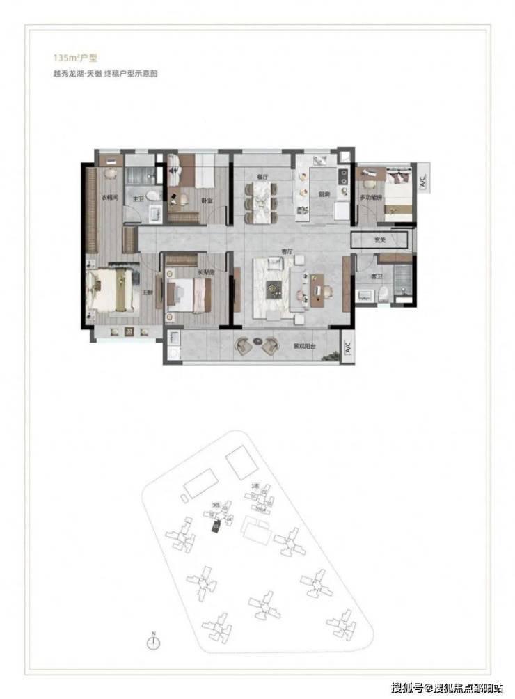 整个项目小区总共9栋高层住宅,最高24-26层,2梯4户/2梯5户设计,户型涵盖95-135平。