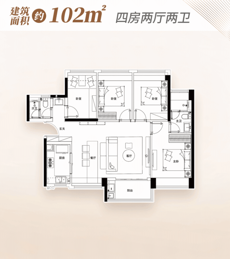 再来看看建面约102㎡户型,则以阔绰空间和多功能设计,从容应对多元家庭结构,实现品质生活的全面升级。