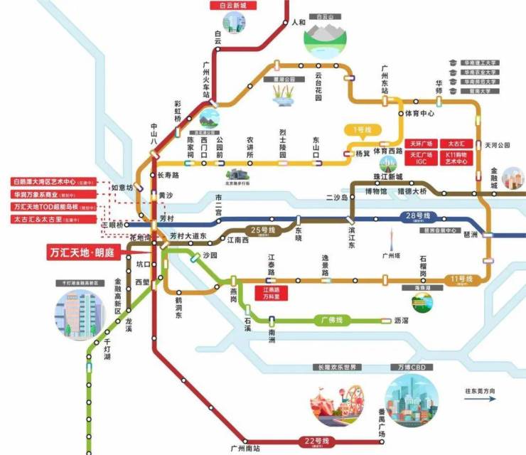15条城市、城际轨道(规划中)汇聚,3地铁6线交汇(规划中)无缝链接大湾区,花地湾TOD超链中心(规划中)1号线、25号线(规划中)接驳,串联商业、办公,立体生活触手可及。