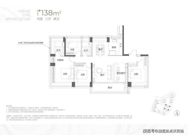 竖庭格局,西南向,基本居住功能与建面约108-110㎡4房2卫一致,但格局不一样,从目前公布的户型图上看,主要是主卧空间有了更大的提升,比如可以放更大一点的衣柜。但从位置上看,它所在的楼栋更靠近主干道,会有噪音影响。