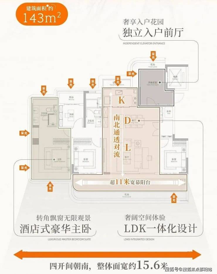 143㎡的四房两厅两卫户型,以 “宽” 和 “精” 著称。独立入户前厅,仪式感拉满。客餐厅纵向拉通至阳台,形成 “剧场式” 公厅,南向面宽超 15 米,LDKB 一体化大宽厅,尽显大宅风范。三面宽的观景阳台连接双次卧,主卧配备转角大飘窗和双台盆,享受高品质生活。